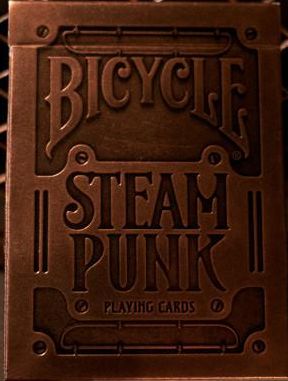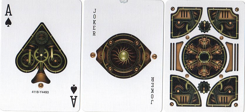 Steampunk. I picked up this deck which cost way too much for a simple deck of cards, especially considering there's not much in the way of different designs. I've taken a picture of the box from the Theory 11 website, though I should say my own box is a shinier gold color, whereas the pic on the site looks more like a dull brown, as you can see. I scanned the only three other things that are special about the deck: the ace of spades (the only ace that is special), the joker, and the card back. There's nothing wrong with the cards, but I was hoping for more different designs on each rank, at least. But they're all just normal cards. Oh well.
