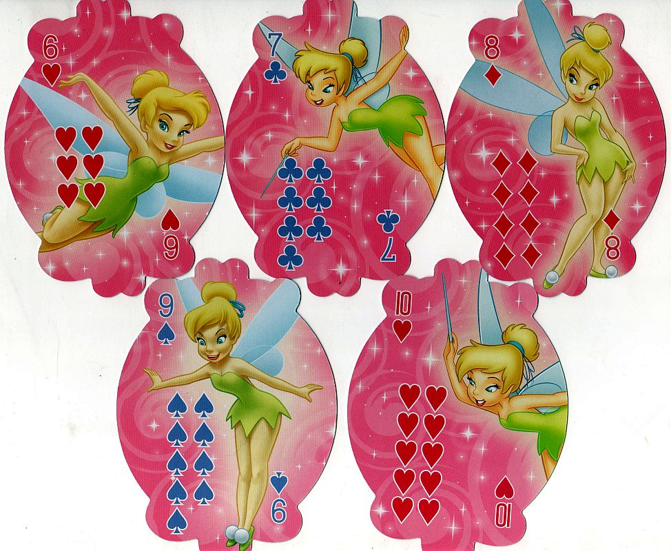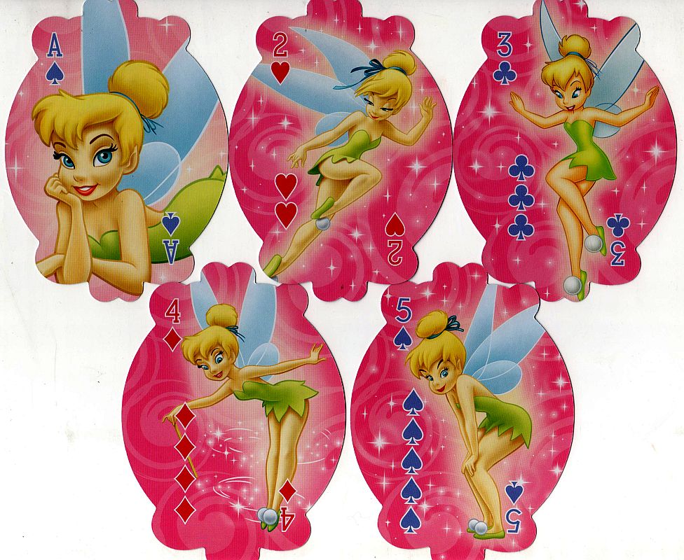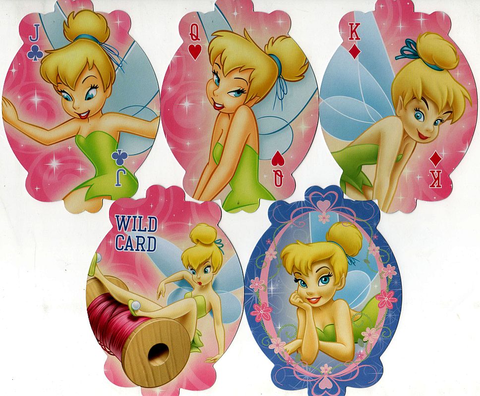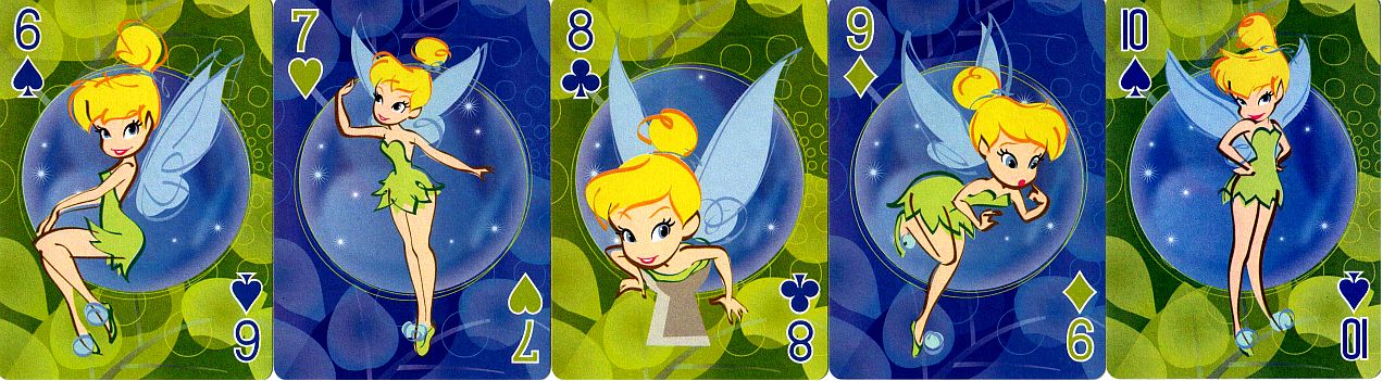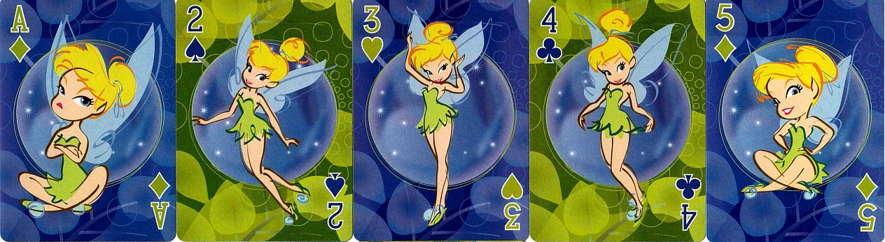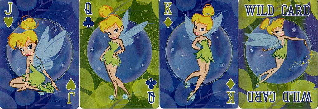 Here are two decks of playing cards featuring Tinker Bell (from Peter Pan). I used the back from the first deck as the index page link to this page; the back from the other deck is included on this page. I also have a deck of Tinker Bell mini-cards, but they have pretty much the same pics as the second deck on this page, so I didn't bother scanning them. I originally included a deck featuring Tink and her friends on this page, but I moved it to a separate Disney Fairies page.