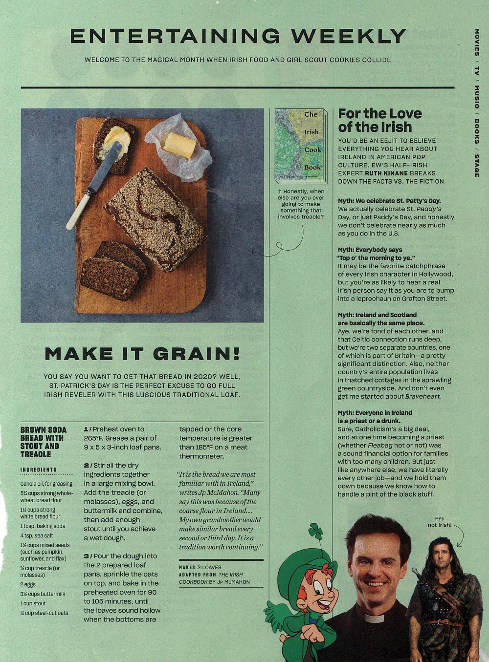 There's a leprechaun decoration that my dad got me, I would guess at a dollar store, a week or so ago. I put it up on my bedroom door today. And in my bedroom window, I put up a string of clover-shaped lights that I think my sister probably got me some year in the past, but I don't remember when. And I can't find a mention of it in my St. Patrick's Day journals. So, whatever... this is my first time taking it out of the package, anyway. Also I scanned a page from Entertainment Weekly with a recipe for brown soda bread. Maybe tomorrow I'll pick up the ingredients necessary to make it (the ones not already in the house). Or maybe not. We'll see.