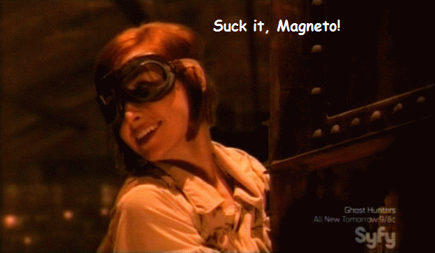 Claudia, from "Warehouse 13." She was wearing a magnetized coat so she could climb up to change a light bulb. At this point from which I made the screencap, she's saying "Sweet, I can totally see my house from here." Which was cool... I like pretty much everything she ever says or does. But I preferred the Magneto line from the start of the climb, which I added to the siggy. I used a later image because you couldn't really see her clearly at all for the earlier line....
