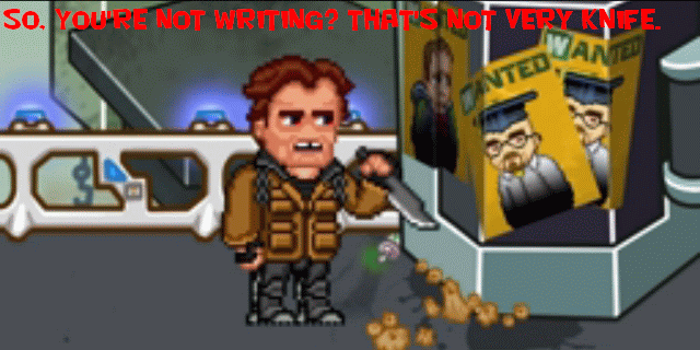 This uses a scene from the Geek & Sundry series "Outlands," and kind of parodies all the "you should be writing" memes on facebook.