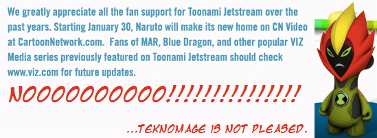 It was bad enough losing Toonami on TV, but losing Toonami Jetstream as well? Dammit. This frees up some time for me each week, but... it still sucks. Alot.