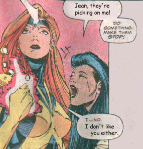 This is my page for my animated enimy: Opal Tanaka. Okay, so she's not an X-person and she's certainly not one of my favorites, but I need to let off some steam and rag on people every once in a while. But I can't spend too much time on her, for fear that I might gag to death. Anyway, she dated Bobby for awhile, dumped him for a guy who kept calling her "cousin" (can you say, "eeeew"?) and was never to be heard from again. Thank god. I think the Marvel complaint department was becoming a hassle from all the letters and calls to get her removed. If you want more info on Opal, or if you hate her as much as everyone else, be sure to visit http://buckshot.fanspace.com/ for a great anti-Opal site.