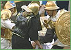 The players get their armor in the Gladiator game. The players will have to draw blood, sort of. Each gladiator's armor has a lion on it, and the lion contains an egg of red dye. If they break the egg, it is considered a kill.