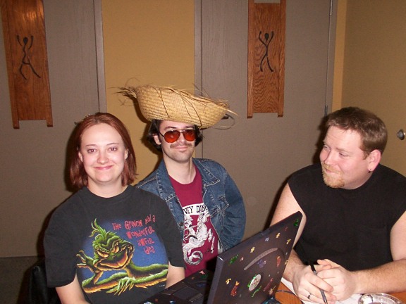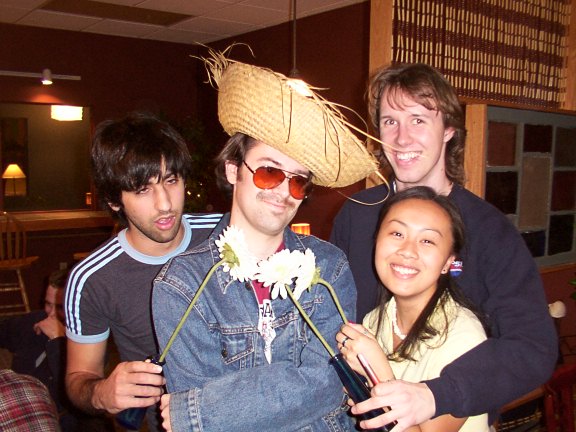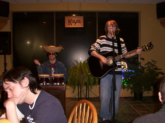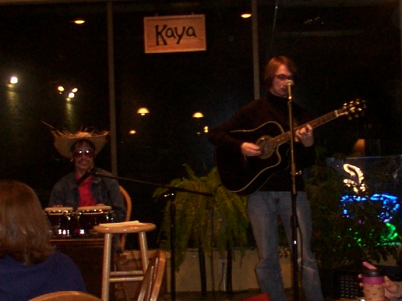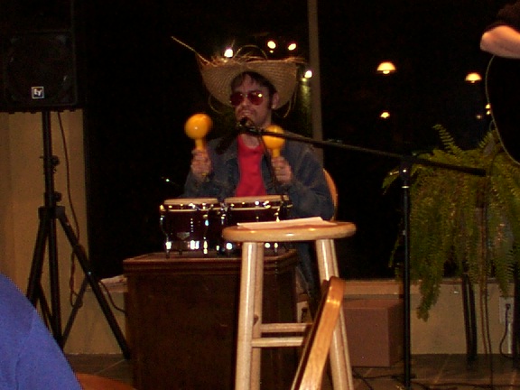 February 24, 2003: Seen performing at Kaya with local singer slash guitarist Ron Thibault. Ron says, "Playing with Chad the Mexican is like a dream for me. No, literally, I once had this dream where I played guitar with a strange Mexican bongo player. We traveled around the world in a purple saucer and played private concerts for European royalty. The King of Belgium liked us so much he invited us back next year." .....riiiiight.