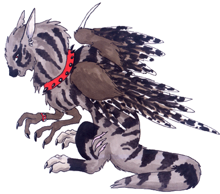 You walk from the Highland Realm Entrance toward the sound of water. The babbling of the brook becomes louder as you begin to notice larger rocky outcrops in the moist, dark green land before you. A murder of crows seems to chuckle at you as they fly overhead dotting the cloud blanketed sky. You furrow your brow at them and continue on slightly disgruntled. The area lacks trees but you can see a lush forest lining the horizon. The earth is dark brown, the grass is thick and vibrant and the stones jutting from the ground make a great contrast to the darker, earthy tones. While glancing at these light silver stones, you notice what look to be claw marks. You take a closer look and notice that someone or something has scratched strange symbols into these rocks. You take a look at another and yet another, and still another; it seems all of them have been marked. Just as you begin to ponder this, a hot feeling rushes through you and ice cold, needle-like pricks tingle your skin. You twist, flinch and writhe with this odd feeling, this confliction of senses. When the feeling leaves you, you're left short of breath and tense. You look around wildly, suddenly feeling hunted, watched. Your eyes canvas the area but you see nothing, the Highlands are void of danger. A wind whispers passed, disturbing the tall grasses and sending a chill up your spine. You suddenly realize you've crouched down near the last rock you read; a product of whatever unsettled you a moment ago. You shake your head trying in vain to rid yourself of the hot-cold miasma that has clutched your mind and soul so rapidly. With a grimace, you continue on. The ground begins to elevate, you trudge up the hill and when you reach the top your eyes widen in awe. Below you on a flat patch of dark earth surrounded by deep green grasses, are the ruins of what might have been a temple. A few stone pillars still stand as well as statues that line the path to the patch. The centerpiece still stands, a large fountain and beyond that, a tower that may have been connected to the fallen stones that litter the rest of the area. You eagerly march down the hill to the flat dirt road that hasn't had a track on it in ages. You admire the stone statues, so life-like. You are slightly disturbed by their cryptic stares and screaming, tortured expressions like they were suddenly attacked or were in so much pain they could only cry until Death. Gryphons, Dragons, Unicorns, Wyrms, Lions, Wolves, even a Bat, the statues litter this portion of the Ruins. You reach the fountain and admire it for a moment. You walk slowly around it until you are infront of the tower but your eyes remain on the fountain. Was this the water you heard? The fountain is still functionning perfectly but how could you have been hearing it from so far away? The statue is of a young woman, part cat it would seem, with snakes curling around her apparently squeezing her, for her face is cringing. She is reaching toward the sky and a snake is coiled around her arm hissing toward the clouds as well. A wind stirs a bit of dirt around your feet and a shadow is cast over you. Before you can turn something pounces down on you and rises your body from the ground. It drops you to the earth and dives down on you again and again, once more and then he pounces down on you. You cough, cringe and try to push it off. You cannot move, the weight of your attacker is far too great. You feel a hot burst of air against your neck and cheek. The creature growls deep within its throat, opening its mouth seemingly for the grumble gets louder then quiets. It snorts against your skin and then takes a drawn out breath, getting your scent... tasting you. In a quick, single movement and a violent push, the creature seems to have gone. You suddenly start to breathe again, heavily and hesitate to sit up. Your cheek pressed against the cold, damp earth and the feeling that you have survived nearly becoming a meal makes you fall into a dream-like state. It's not quite euphoric but a peaceful, calm envelopment of passing fear. After a moment of phasing out of reality, you push your aching body upward and sit up. You lose your breath as your eyes widen and you instinctively shuffle backward still on your hind end. A large Gryphon-like creature is clutching the statue from the back, snarling at you viciously. Its tail is wrapped around the base and its body looms over the figure. Its eyes lock with yours and it spreads its brown, black spotted wings. It pounces down to the earth, a mere foot from you. It begins to circle you, with a limp. The creature is hunched over, a bipedal creature; its bird-like forelimbs seem somewhat useless. ![]() Apart from the scar on its left leg and his tattered right wing, its thick grey fur is untouched but by its charcoal markings. Its stiff ears are pierced by silver earings which draws you to its predatorial eyes. A glimpse of striking red gets your immediate attention. Clasped around its neck and right foreleg are red leather, spiked collars. It shines its fangs and snorts. "You are unwelcome here, trespasser," his voice is dark, raspy but deep. "There's nothing for you here," he growls. You kneel before him and try desperately to utter something, anything, but your voice is lost. He continues to circle you, slowly as if he were taunting you. You get the urge to flee, but inside you, you know that's what he wants - the hunt. The creature laughs evilly and it breaks out into a maniacal, hysterical roar. His laughter quiets into chuckles, it reminds you of a cross between a feline's hiss, a canine's howl and a crow's caw. "Ah ha ha! You travellers are always so uptight! So disappointing, no chase and all the tension makes your carcasses tough to chew." He sneers sinisterly. Your eyes widen and he laughs even more nefariously. He is neither mysterious or dark but a complete psychopath. He feigns to pounce on you and you jump to your feet, stumbling back. He grins evilly, narrowing his red 