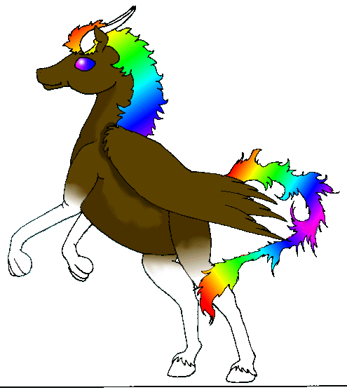 The cloudy light dances on her rainbow mane and fluffy tail. The mare lowers her head in a curt bow. The chocolate color of her coat is accented by white stockings on each of her four legs and shining curved horns. She stares at you with blue eyes highlighted with a magenta hue. You see her wings twitch. "I am Halcyon Phantasy of Lanse'shri, the Everrealm. Like the other Leagi in this realm, I chose a title name for formalities-sake." Pryzm shakes her mane absently. You notice her claws are digging into the decaying wood and moss. "Forgive me, traveller." The Leagus mare quickly vanishes in a wink of her multicolored tail.