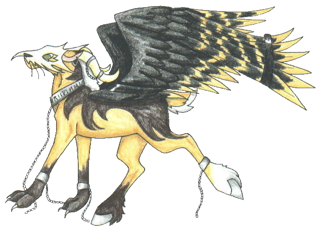 ![]() ![]() ![]() ![]() You leave the second portal from the Shadow Realm and enter into a cold, damp place crawling with mist. Before you stands an iron fence. Thin, arrow-headed spikes stabbing toward the sky an inch apart. A similar bar lines the top and bottom of the fence about three inches from the actual point. The gate opens on its own and you follow the mist into the cemetary. The air is still and cool yet your skin feels scaly and hot. The graves are interlaced with rose bushes. Despite the eerie terror creeping and clawing at your soul, the soft, sweet smell of roses contradicts it so perfectly it creates a derranged-type of harmony. The mist dances unnaturally; crawling slowly, then quickly, then slowing once more to a steady pace. It reminds you of someone filming, then taking away some of the frames. A wind blows up behind you sending such a cold rush through your soul that you immediately whip around. You let out a little yelp of surprise when you see shadowy black and red figures floating behind you. ![]() Some seem to be from a science-fiction movie while others sit atop horse-like creatures reminding you of the middle ages. They walk straight passed you, as though their bright, dilated white eyes cannot see you. Rows upon rows of these phantom creatures float by up a hill but twenty paces from where you stand. You gaze in awe, fear tearing you apart, yet you are paralyzed and drawn to their point of destination. Like one possessed, you walk up the hill in slow, unwilling steps and you feel that you're not even touching the ground. Once settled atop the elevated earth, you gaze down at a most overwhelming sight. On the other side of the cemetary, on a similar hill opposing this one, is a line of black and red phantoms. You notice to your left and right are smaller hills with the same ghostly apparations standing at the ready. The depression in the center is dotted by a peculiar creature. Its hide is as golden as the sun or desert sand. The ivory white Dragon's skull shines silver in the moonlight. You hear her chains hitting the ground as she takes two steps away from a blood tree. A smooth tombstone rests underneath the tree but it is only dually noted in your mind. You watch the charcoal marked beauty calmly step up to a marble fountain. Though it is scarred by the ages, liquid still spouts from the half-fish, half-equine's mouth. You furrow your brow; that isn't water. It looks like mercury, liquid but silver and it breaks off in an odd fashion. You watch this chrome-like water pause in the air before falling into the fountain's base. The creature, your subconcious mind recognizes to be a Frondari, sips delicately from pool. She tosses her head up and you realize she must have sensed your presence as she seems oblivious to the armies surrounding her from all sides. To your astonishment, she rises up on her hindlegs with a wild call that is both a roar and a whinny. Her head bobs in circles as she flails the empty air and spins on her heels gracefully before settling. As her forepaws touch the ground the four clusters of Phantoms charges toward one another. You watch them. They move in an unnatural manner. Some move robotically like someone has taken out frames in a film, just like the mists. Others move swiftly but for every twelve feet they cover, they're sent back half of that. Some glide in slow, rhythmical movements floating on the breeze. Still others ride on beasts of burden that, despite appearing to be running full throttle, are not getting very far. These Phantoms move through her much like they did you and collide in an explosion of black and red. You watch as they tear each other apart in a twisted ballet. Their "flesh" tears like thin, durable fabric and pieces remaining floating; never touching the earth. Your eyes return to the golden one who has not moved. She raises her head to look at the full moon. Instinctively, you look up to see what she's watching so attentively. A mass of black and white covers the moon being only semi-transparent. It look to be the Phantom of... yes, a Dragon. The skeletal being swoops down on the war scene and releases a mighty breath of fire. Its four feathered wings catch flame as well and you shield yourself from an explosion. You look back to see the area littered with ash. The wind takes one swoop and the ash vanishes into the sky, disappearing into the stars. The Frondari mare still stands solemnly alone. You see a sparkle near her eye and watch a tear fall to the earth. From it sprouts a rose, it matures into a bud and blooms within moments. Her head falls and she turns toward the tree that was untouched by the Phantom Fire. She seems to vanish in the shadow of the great tree and, anxiously, you run down the hill. Despite your pounding heart and fear in your blood, you want to meet her. A dead wind sends shivers up your spine and you turn around only to be eye to eye with the Frondari. You let out a small cry of surprise and stumble back. ![]() ![]() You gaze up, from the ground, in marvel of the horse-sized creature. Her sharp claws glimmer menacingly in the moonlight as she approaches you. Every step from her, you shuffle two back still on your behind. The chains from her collar, shackles and horn ornament clatter together like that of a burdened spirit. The silver light reflects off the black leather straps binding her black, tan-stricken wings. The dragon skull masking her face strikes you as odd but the sorrow in her eyes puts away your question. "Hush hush, quiet now, before you wake the demons." The creature's voice is soft, a whisper, like downy feathers; she speaks with a purr. Her deer tail twitches slightly as a cold, ice cold, wind whispers by stirring the mist around the entity's ankles. "I am Dream Hiding Eternal Chaos, second Frondari of the Shadow Realm; third overall. Perhaps one day, you will know my story. One day," she dips her head and, with a small snap to the wind, she gracefully bounds off into t