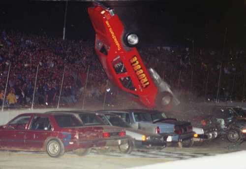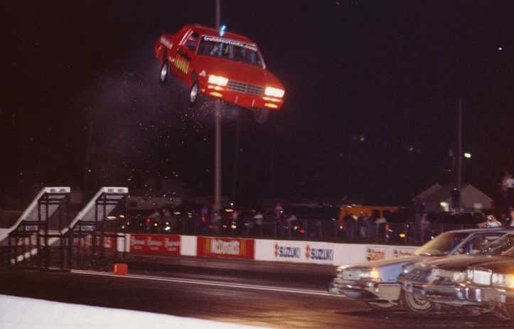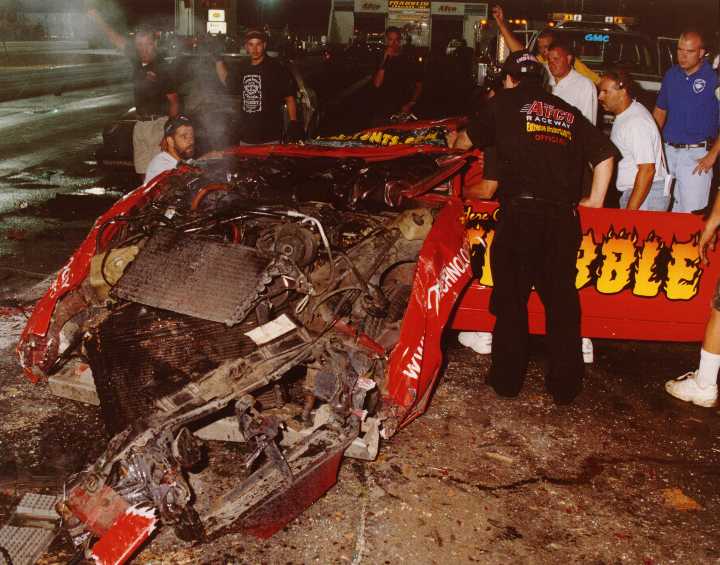 Driver is still inside this car, after a stunt at Atco Raceway in New Jersey in 2001.