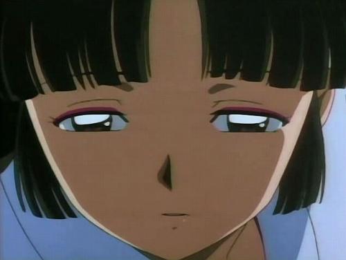 Sango in her fighting outfit(below), the mask prevents them from breathing poisen the giant boomerand is her weapon its made of demon bones and can cut demons in half.
