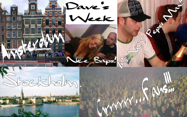 Anyway, the week started off in Sweden and yes I know it sounds lovely, what with all the Swedish girls and geysers, but unfortunately no such luck for old Davey boy! The girls were all much more interested in Barney and Bob and the Geysers aren't really my thing... honest! Anyway Ken and Jim weren't there cos Ken was playing football, or at least trying to and Jim doesn't need to come to the studio for obvious reasons... no need to mime in there cos nobody's watching! So I only had two idiots to keep an eye on and even that proved difficult what with those goddam Swedish fans. Now in the past Westside have been known to have a whinge about how the Swedish girls treat them like sex objects and it makes them feel used, so I was on strict watch to keep any leering eyes away from the precious little innocents who's mammy's only let them out till 10pm. Now I had enough of a job on my hands stopping the girls leering at the two brunettes, thank God Ken wasn't there as stopping people from making the connection between a long hard piece of plastic, Ken and a sex object is beyond even my considerable talents. Anyway I had to chaperone the boys on a night out, otherwise their mammy's wouldn't sign their permission slips to break curfew so I ended up stood in the corner all night while Barney drank Pepsi Max and Bob chewed on his nuts... peanuts not Barney's nuts!!