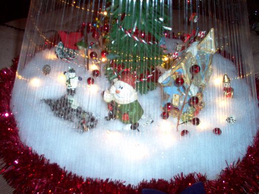 Here is a close up view of Tree #7. There is a snowman on skis and a large pond with a little snowman (my daughter says it is father and son) on a large pond. There is a decorated bush and a light pole by the pond. Also there is a house with a small angel on the front. The center of the tree is decorated with red garland and red, green, and white twisted ribbon. |