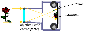 Na figura está representada a câmara fotográfica simplificada, sem os refinamentos óticos ou mecânicos. A objetiva está representada por uma única lente convergente que forma uma imagem real e invertida do objeto fotografado sobre o filme situado na parte posterior da máquina.