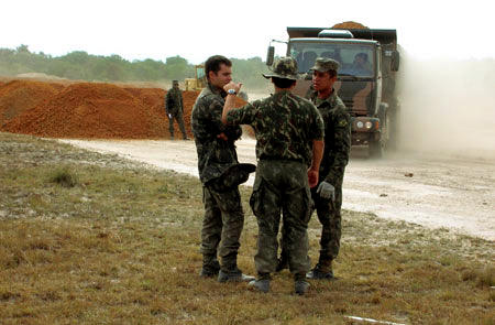 Colonel Bruce Lovell in deep conversation with a Brazillian military official at the Guyana/Brazil border