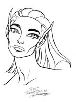 Name - Sleia Current Status - Alive Description - Sleia is the daughter of Lazik and Shoseabee, and half sister to Inkbottom. She has a well-toned body for a female elf and is shorter than the average WaveDancer. She has crystal blue eyes and light sandy-brown hair which she keeps braided. She has a square jaw, a broad nose and strong forehead. Sleia is not known as a pretty elf, but what she lacks in looks is made up tenfold in courage and personality. She can be wilful and cheeky, and is very nimble. She is Barmek's best friend, and is loyal, honesty and trustworthy. Quiet and a little reserved around most of the others, she blossoms into a gregarious and delightful personality when she is adventuring with Barmek. She can be humorous, outgoing and talkative and is the more practical of the two. Sleia can move with great stealth, and is very comfortable with her body and her sporting prowess. |