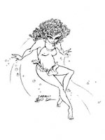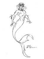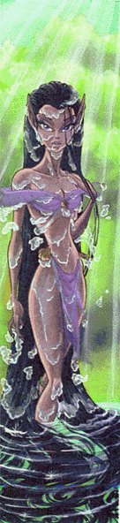 Name - Tilaweed Current Status - Alive Description - Tilaweed is one of the oldest mer-elves in the WaveDancer colony. She is about 5 foot 10 inches with her tail. She carries herself with dignity as if she is of royal birth, but this is a natural quality rather than a false persona. She has long golden blonde hair and large ice blue eyes, and wears a girdle and head-dress of pearls and shells. Her tail is a green blue with some pink through her fin. She possesses many great talents. She is a musician: she has a beautiful lyrical voice that can soothe the soul and lull the mind, but she rarely chooses to sing because she mourns for her lost Child of Recognition. Tilaweed is estranged from her soul-mate Hyfus. She is a loner and tends to be secretive, but her glamorous facade hides her sensitivity and pain. Tilaweed spends her time equally above and below water though she can never venture on land because of her tail. |