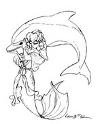 Name - Kirith Current Status - Alive Description - Kirith is slightly smaller and rounder than the average WaveDancer. She has long hair bundled up for practical purposes into a hair net, and her tail is green. Her skin is the colour of pearls and she has huge brown eyes. She possess the wisdom and teaching of the dolphins behind her and shares a special relationship with them. Though she is a third generation WaveDancer, she is one of the elders. She is also known as the "birthing mother" by the others as she is the midwife to the colony. Kirith can be spirited and frisky, but is also very responsible: she was entrusted by Brom to look after and educate Raenafel which she achieved with the utmost care and secrecy. Rhialdor is Kirith's lifemate, and she is the mother of Jormak and Barmek. |