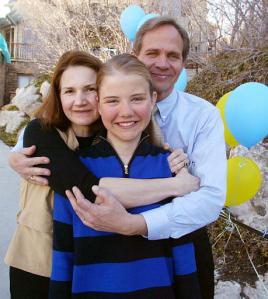 Elizabeth Smart poses with her parents, Ed and Lois, at their Salt Lake City home Thursday, March 13, 2003. Elizabeth, who was taken from her home last June, was found Wednesday. |