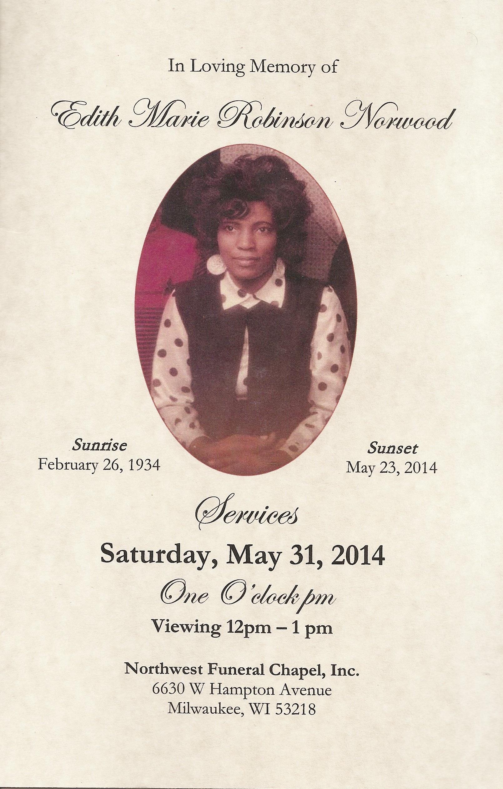 Not since October 2000 had I been there. But on Saturday, May 31, 2014, there was a homegoing celebration for Aunt Edith Marie "Kitty" Robinson Norwood at Northwest Funeral Chapel, Inc. in Milwaukee, Wisconsin. She was the younger of two sisters of my late father Willie I. Robinson, and the daughter of Thornton Edgar Robinson (August 11, 1888 - October 02, 1933) and Narcis Bailey Robinson (April 16, 1901 - December 28, 1938). Aunt Kitty was born on February 26, 1934 in Mississippi.