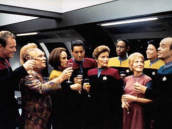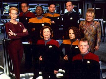 From left to right, Tom, Neelix, B'Elanna, Chakotay, Janeway, Tuvok, Kes, Kim, the doctor. This was the crew the first three seasons. Captain Janeway's hair was longer and often worn pinned up. Kes left the series at the end of third season.