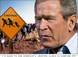 THE PRESIDENT: Thank you. You know, they say good fences make for good neighbors, but to that I say: hiring your neighbors to mow your lawn makes them even gooder. That is why I am here today, in the misfit metropolis known as El Paso, desperately trying to dispel the fears of honest citizens terrorized that the workforce which keeps America humming might also be spending their nights in cramped, squalid apartments building nuclear jalapeño bombs in the bathtub with the help of their 234 live-in relatives. Two whole years ago, in response to terrorism-fueled paranoia about the human tsunami of illegal immigrants pouring across America's borders, I announced my utterly logical ''sombrero loophole'' plan, which gives illegals the green light to take jobs from poor and desperate American citizens, or in today's terms, the entire hurricane-ravaged Gulf coast. Today, for whatever reason, people are still whining about it. Which is why, in keeping with my policy of absolutely, positively, never-ever giving an inch on my super-brilliant ideas, I am pleased today to release differently packaged details of the same exact plan – this time with a wink. The wink is code to all you people who think we should dig thousands of miles of barb-wire covered trenches filled with scorpions, scorpions with THE AIDS. While I don't hate your idea, I would ask you to give my idea some more thought. Once you do, you'll agree that tagging these Latin Arabs like cattle and tracking them down whenever it suits us is just as fantastically closed-minded and paranoid as your idea! So it is with as much pomp and circumstance as Jorge the one-man-mariachi band can muster, I proudly present the Mexi-Rican Guest Worker Bill Of Rights. 1. MEXI-RICAN GUEST WORKERS SHALL MAKE NO COMPLAINT RESPECTING AN ESTABLISHMENT OF QUASI-SLAVE LABOR CLASS, OR PROHIBITING THE EXPLOITATION THEREOF, OR ABRIDGING THE RIGHT OF THE PLUTOCRACY TO PEACEABLY SUBJUGATE THE INFERIOR. 2. WELL-REGULATED JANITOR RANKS, BEING NECESSARY TO THE AESTHETICS OF OCEANFRONT COTTAGE FORMAL GARDENS, COUNTRY CLUB FLOWER BEDS, PGA GOLF COURSES, AND/OR THE KENNEBUNKPORT YACHT CLUB, SHALL NOT BE INFRINGED. 3. EVERY MEXI-RICAN SHALL, IN TIME OF GRAVEYARD SHIFTS, BE INCARCERATED IN LOCKED WAL-MARTS, TO LOVINGLY BUFF MILE AFTER ACRE OF SHINY LINOLEUM FLOOR UNDER A BRILLIANT NIGHTTIME SKY OF SEARING FLUORESCENCE. 4. THE RIGHT OF THE MEXI-RICAN TO SAVE CORPORATIONS MILLIONS IN PROFIT-ERODING HEALTHCARE COSTS SHALL NOT BE VIOLATED. IF SICK, EACH GUEST WORKER IS ENTITLED TO ONE FREE RIDE IN THE ''WELLNESS FUNNEL'' ALL THE WAY BACK TO MEXICO. 5. IN ALL DAILY AFFAIRS, MEXI-RICANS SHALL ENJOY THE RIGHT TO BE STALKED AND HARASSED BY XENOPHOBIC WEEKEND VIGILANTES NAMED ''JETHRO'', WHO RIGHTEOUSLY GUARD THE FORMERLY MEXICAN LAND THAT AMERICA STOLE FAIR AND SQUARE. 6. MEXI-RICANS SHALL POSSESS THE RIGHT TO BECOME INDENTURED SERVANTS IN AMERICA'S CHINESE RESTAURANTS AND PIZZARIAS, WHERE THEY WILL LEARN TO STIR-FRY TABLE SCRAPS AND GRATE MOZZARELLA EVEN BETTER THAN CHINKIES OR DAGOS. 7. NO MEXI-RICAN SHALL BE DEPRIVED OF THE RIGHT TO WEAR THIN RUBBER GLOVES AND PAPER MASKS WHILE EXCAVATING THE CITY OF NEW ORLEANS FROM BENEATH A FRAGRANT MOUNTAIN OF CARCINOGENIC SLUDGE. 8. IN JOBS OF COMMON LABOR, WHERE THE VALUE OF COMPENSATION FALLS BELOW THE FEDERAL MINIMUM WAGE, THE RIGHT OF THE MEXI-RICAN TO RENDER JOBLESS ALL WHITE AND BLACK TRASH WHO VOTE DEMOCRAT ANYWAY SHALL BE EXPLICITLY PRESERVED. 9. EXCESSIVE VISIBILITY SHALL NOT BE GRANTED, NOR TECHNICAL AMNESTY GRANTED, NOR CRUEL AND UNUSUAL PUNISHMENTS INFLICTED -- EXCEPT AS IS REQUIRED FOLLOWING FLARE-UPS OF ''LATINO HEAT'' RESULTING IN THE DEFILEMENT OF PURE, ALL-AMERICAN LILLY-WHITE GIRLY-HOOCHIE. 10. FOR THE ACCRUAL OF ADDITIONAL HUMAN RIGHTS NOT SPECIFICALLY DELEGATED BY PRESIDENT GEORGE W. BUSH, ALL MEXI-RICAN GUEST WORKERS SHALL ACCEPT AMERICA'S STANDING OFFER TO GET THE FUCK OUT. I sincerely hope that you all fall head over heels for my pandering bullshit, much the way the Negros did for that other Texan President who promised them civil rights. The only difference is unlike Presidential promises of yesterday, the promises I make today about tomorrow will never come true. This I swear. You may applaud now. (Applause.) Thank you, and hasto le visto, amigoroonis! |