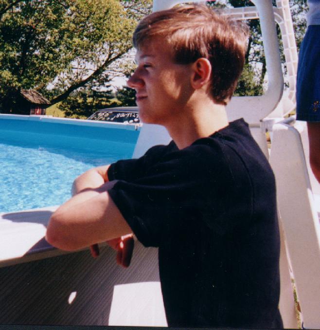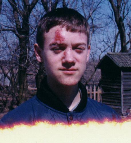1999 was a turning point in my life where I laid myself too low for too long. It started out alright... then on March 23rd, I got in a car accident. I was the only one hurt, and you'll see my injuries! As the year went on, my crush was revealed to the entire school, and I was rejected. Believing that to be a result of my shyness (which I now know to be not true), I got down on myself. That summer, though, I met Jenna online. She accepted me, for some reason, and we went out for six months. The summer was fun, I felt good, had friends, had a nice g/f, and on July 28th, a really cool website! *ahem*. Then I went back to school, and decided to write a paper. On my shyness. Slowly, it began to take the shape of a journal, and through most of that year my random thoughts (and a lot of... simply awful Korn songs) were put in there. In November, Jenna broke up with me, and my self-confidence hit a rock. I just kept on listening to Jon Davis, neglected online, and fell into a spiral of hate... (To Be Continued! Heh heh)