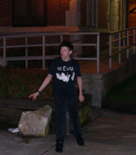 After one of my infamous shots where I banked the frisbee off a tree into the nearby cluster of bushes, the guys went ahead without me. Right about when I was about to throw the frisbee again, I noticed that Tech must have a really weird decorator... these trees look rather gnarled and freakish, and is that... a wooden headstone? About that time, I heard the guys yelling about how they'd found a cool-looking book with a funny face on the front. After that, nothing was the same.