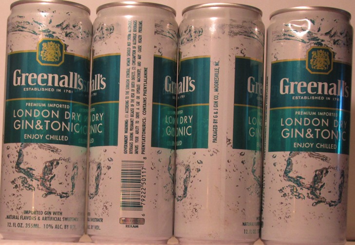 - GREENALL'S LONDON DRY GIN & TONIC PACKAGED BY G &J GIN CO, MOORSEVILLE, NC, REXAM, TALL ALUM., $ 3.00, ONLY ONE AVAILABLE