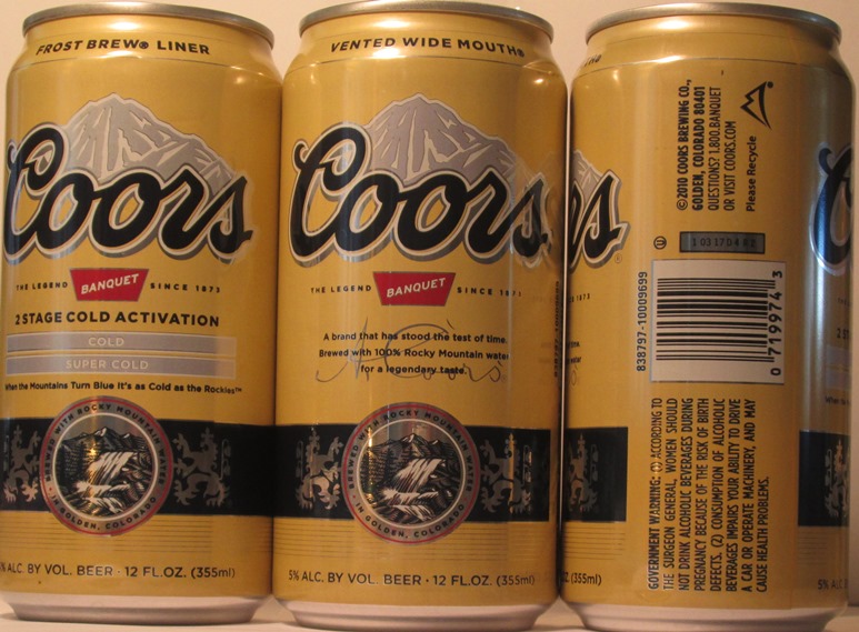 COORS ORIGINAL EST. 1873, PREMIUM BEER BREWED IN GOLDEN, COLORADO WITH ROCKY MOUNTAIN WATER, COLD MESSAGE, (5637), COORS BREWING CO., GOLDEN, CO, TN, GW, ALUM., $ 2.00
