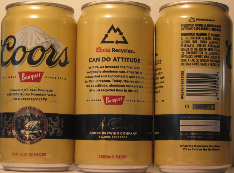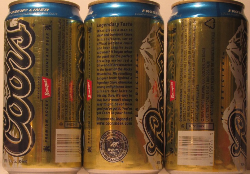 COORS ORIGINAL EST. 1873, PREMIUM BEER BREWED IN GOLDEN, COLORADO WITH ROCKY MOUNTAIN WATER, DATING MESSAGE, (5637), COORS BREWING CO., GOLDEN, CO, TN, GW, ALUM., $ 2.00