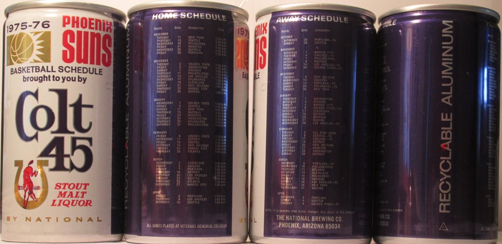 ABC 17-16 COLT 45 STOUT MALT LIQUOR BY NATIONAL, 1975-76 PHOENIX SUNS BASKETBALL SCHEDULE, THE NATIONAL BREWING CO., PHOENIX, ARIZONA, (BANK TOP) AMERICAN CAN (8), ALUM., $ 2.00