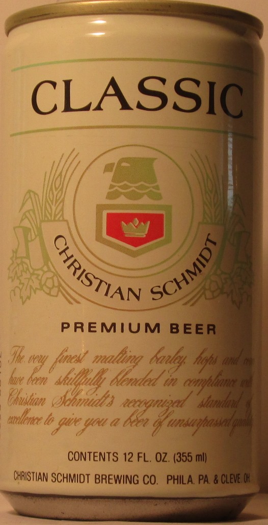 CLASSIC CHRISTIAN SCHMIDT PREMIUM BEER, CHRISTIAN SCHMIDT BRERWING COMPANY, BALTIMORE, PERRY, EVANSVILLE, FRANKENMUTH, (CROWN (QH080), TN, ALUM., GRADE 1+/1, $ 0.75