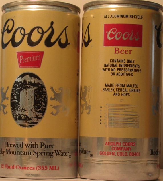 COORS ORIGINAL EST. 1873, PREMIUM BEER BREWED IN GOLDEN, COLORADO WITH ROCKY MOUNTAIN WATER, WATER MESSAGE, (5637), COORS BREWING CO., GOLDEN, CO, TN, GW, ALUM., $ 2.00