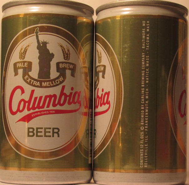 COLUMBIA BEER, PALE BREW, EXTRA MELLOW, BREWED BY CARLING BREWING COMPANY, BALTIMORE, BELLEVILLE, FRANKENMUTH, NATICK, TACOMA, NATIONAL CAN, ALUM., $ 1.25