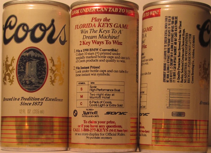 COORS EXTRA GOLD DRAFT, A FULL-BODIED, ROBUST BEER, 12 FL. OZ. (355ml), PLAY THE FLORIDA KEYS GAME, WIN THE KEYS TO A DREAM MACHINE, 1990, COORS BREWING COMPANY, GOLDEN, CO., GW, ALUM., $ 1.50