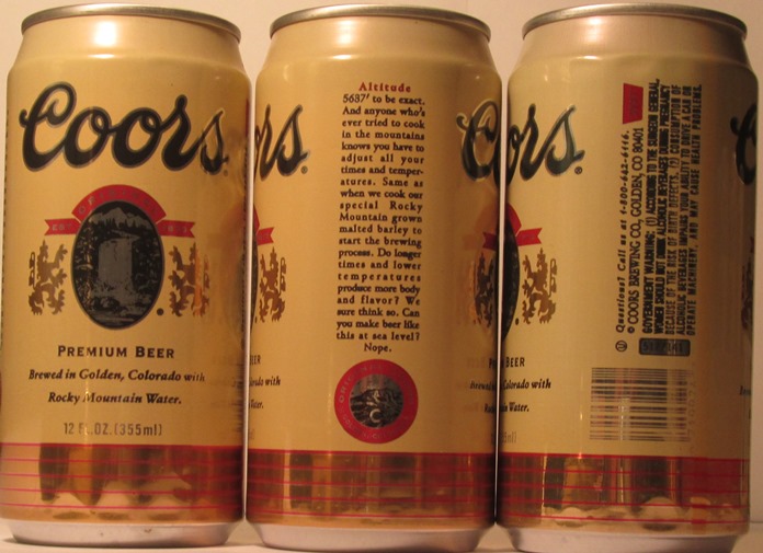 COORS ORIGINAL EST. 1873, PREMIUM BEER BREWED IN GOLDEN, COLORADO WITH ROCKY MOUNTAIN WATER, ALTITUDE MESSAGE, (5637), COORS BREWING CO., GOLDEN, CO, TN, GW, ALUM., $ 2.00