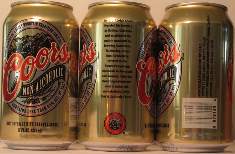 COORS NON-ALCOHOLIC, COORS BREWING CO. A ROCKY MOUNTAIN TRADITION SINCE 1873, CONTAINS LESS THAN 0.5% ALC. BY VOL., MALT BEVERAGE WITH CARMEL COLOR, 2007, BREWED BY COORS CANADA, TORONTO, CANADA, IMORTED BY COORS BREWING COMPANY, GOLDEN, CO., TN, ALUM., $ 2.00