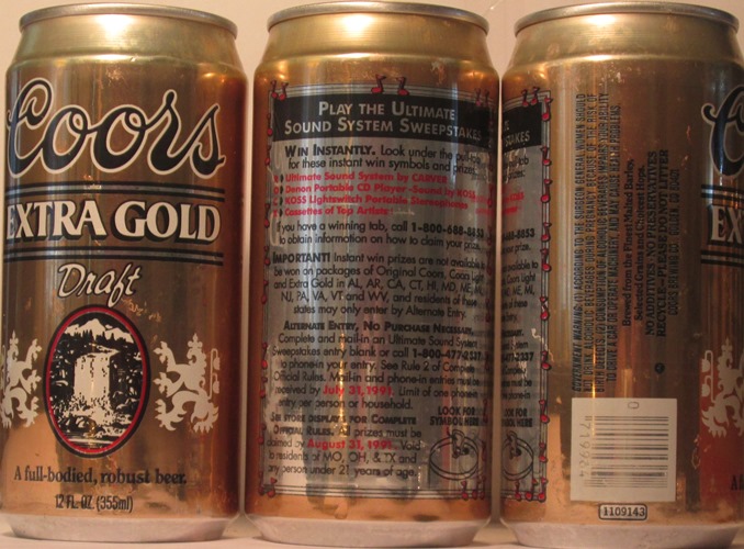 COORS EXTRA GOLD DRAFT, A FULL-BODIED, ROBUST BEER, PLAY THE ULTIMATE SOUND SYSTEMS SWEEPSTAKES, 1991, COORS BRERWING CO., GOLDEN CO., TN, GW, ALUM., $ 1.50