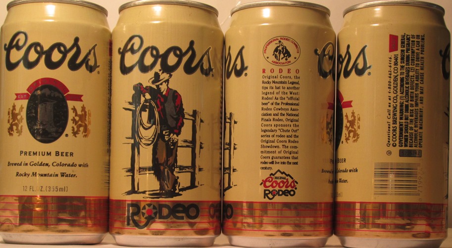 COORS ORIGINAL EST. 1873, PREMIUM BEER BREWED IN GOLDEN, COLORADO WITH ROCKY MOUNTIAN WATER, ORIGINAL COORS RODEO, PROFESSIONAL RODEO COWBOYS ASSOCIATION, (SADDLE/COWBOY/5637) COORS BREWING CO., GOLDEN, CO TN, GW, ALUM., $ 2.00