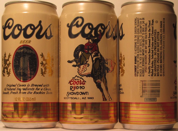 COORS BEER, ORIGINAL COORS IS BREWED WITH ALL NATURAL INGREDIENTS FOR A CLEAN, SMOOTH, FRESH FROM THE ROCKIES TASTE, ORIGINAL COORS RODEO SHOWDOWN SCOTTSDALE, AZ., 1993, , COORS BREWING CO., GOLDEN, CO., TN, GW, ALUM., $ 2.00