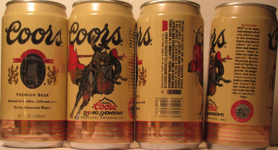 COORS ORIGINAL EST. 1873, PREMIUM BEER BREWED IN GOLDEN, COLORADO WITH ROCKY MOUNTIAN WATER, ORIGINAL COORS RODEO SHOWDOWN SCOTTSDALE, ARIZONA, 1994, , COORS BREWING CO., GOLDEN, CO., TN, GW, ALUM., $ 2.00