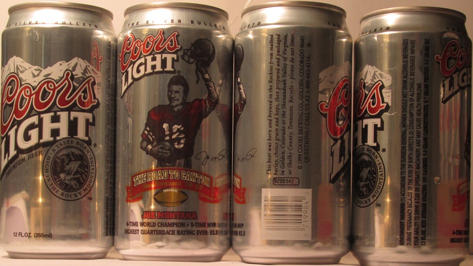 COORS JOE MONTANA, THE ROAD TO CANTION, SAN FRANCISCO '79 - '93, COORS BREWING, CO., GOLDEN, CO., TN, GW, ALUM., $ 3.00