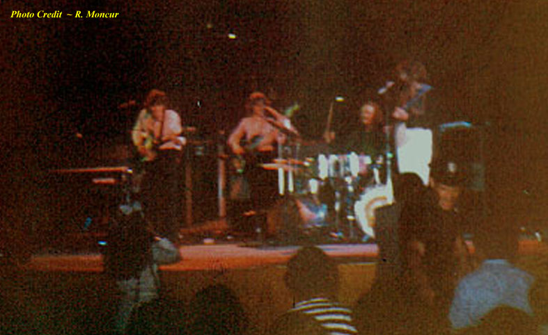 Even more security is hovering around the stage, full MSG maximum lighting is on. Notice that the stage has revolved 180 degrees (Ginger's drums face away, he's turned on his seat looking behind), with everyone's attention on whatever is happening at the left edge of the stage from where the camera holder is standing. Also notice that several in the audience are holding two fingered "peace brother" signs above their heads. Something is definately happening.