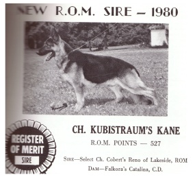 | Sire Sel Ch Cobert's Reno of Lakeside ROM OFA | GrandSire A/CGVCh Lance of Fran-Jo ROM | Ch Fortune of Arbywood ROM | GV, IntCh Troll vom Richterbach SchH3 ROM |