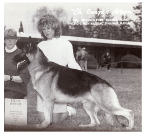 | Sire Ch Omega's First Edition ROMC | GV, Can Sel Ch Woodside's Nestle's Quik v Merwestyn ROM/C HT AOE OFA | GV,ACCh Rio Valle's Nestles Crunch ROM/C | ACSel Ch Stuttgart's Sundance Kid ROM/C |