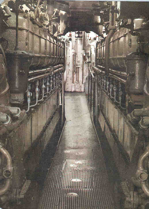 Когда ПЛ шла на поверхности, ее двигали 2 восьмицилиндровые, 2 170-сильные дизели, вращавшие пару винтов в корме. Благодаря им, лодка развивала скорость 19 узлов. Дизели также приводили в действие генераторы, подзаряжавшие батареи. |