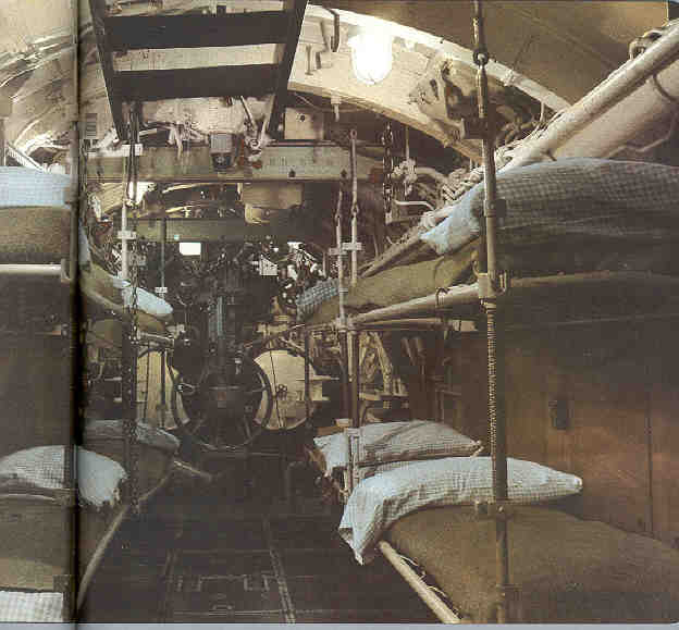 Кормовой торпедный отсек имел 8 коек для 16-ти членов экипажа, 2 торпедных аппарата и запасной рулевой штурвал. Жить и работать в таком тесноте было очень тяжело. |
