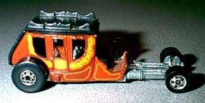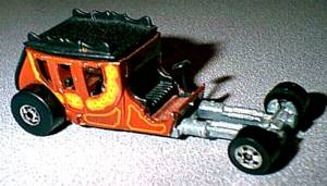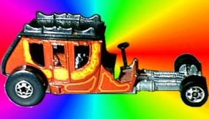 Here is a another look at Stage fright. You will notice the stage coach look with the steering wheel and bench seating for two. This car is from Malaysia and books for about 10 bucks. I really love these old blackwalls, they are cheap and cool, and you can still get some good deals on them. There is a really rare version of this car I have never personally seen yet. Its the same car, but its a dark brown, or burnt brown in color, and it is made in Mexico. That version books for 70 dollars. I think I'm going to take a trip to Mexico one day and dig up some of all the rare cars that seem to originate from there.