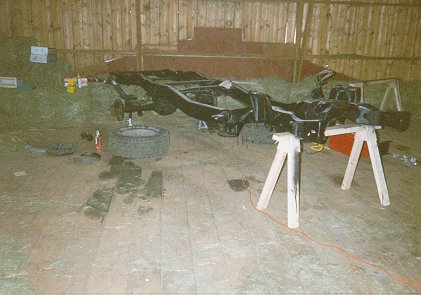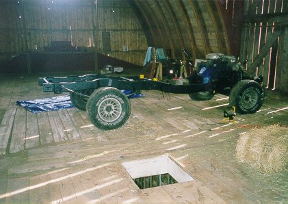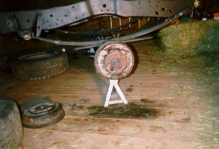 Feburary 1997. It was getting too cold over in the shed so I moved it up into the barn. Here I had a solid floor and electricity, and the hay helped insulate the heat from the cows downstairs. Here are the all new brakes, along with new springs. The old ones had a cracked leaf in each side.