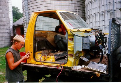 Hey! There I am using the KLI one-ton to transport my cab from Trucks and Such (Gotham, WI). It is a 1986 cab from Texas, I saw the registration in all of the trash on the floor. I took out the dash, heating, and brake booster parts because I knew the old ones worked. I did have to put my old steering column bracket on so I would have a place to attach the clutch. That is my Friend Jamie helping me, thanks bud!